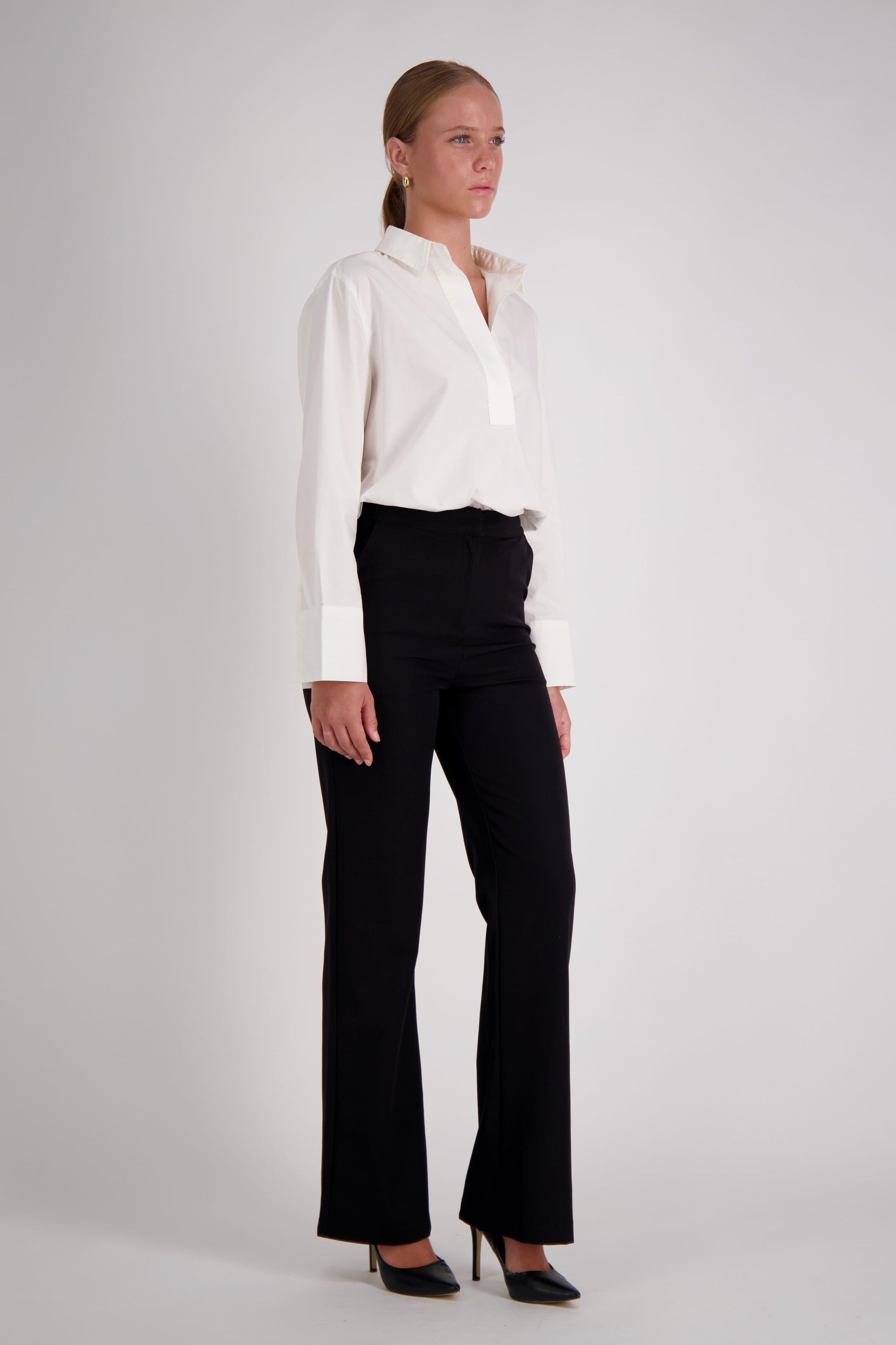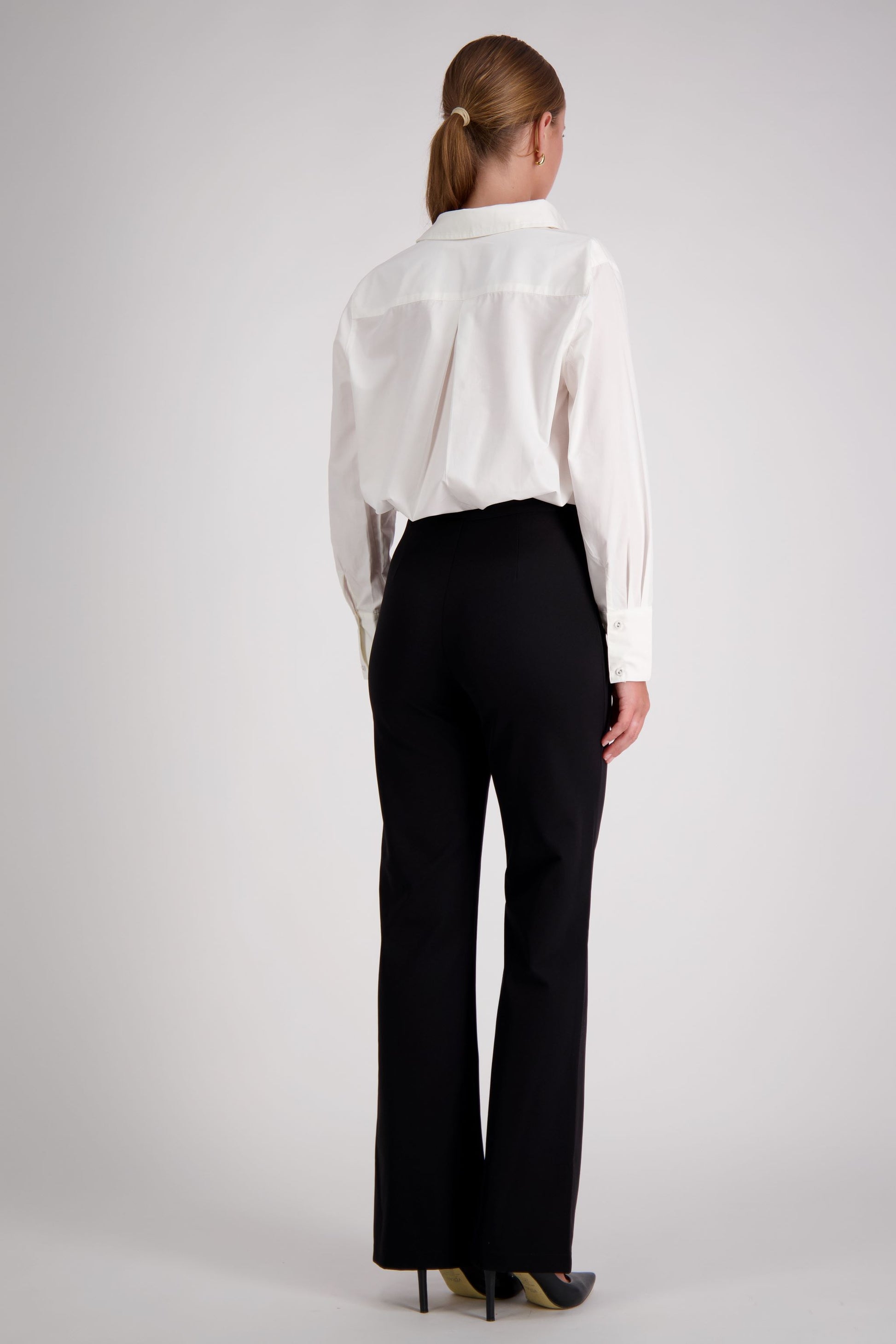 Introducing The Power Pant, the perfect addition to any woman's work wardrobe. Our Black Flared Work Power Pant is designed with a sleek black look that exudes professionalism and style. With a neatly fitted waistband and functional pockets, these pants are both practical and fashionable. Our model wears a size 8.